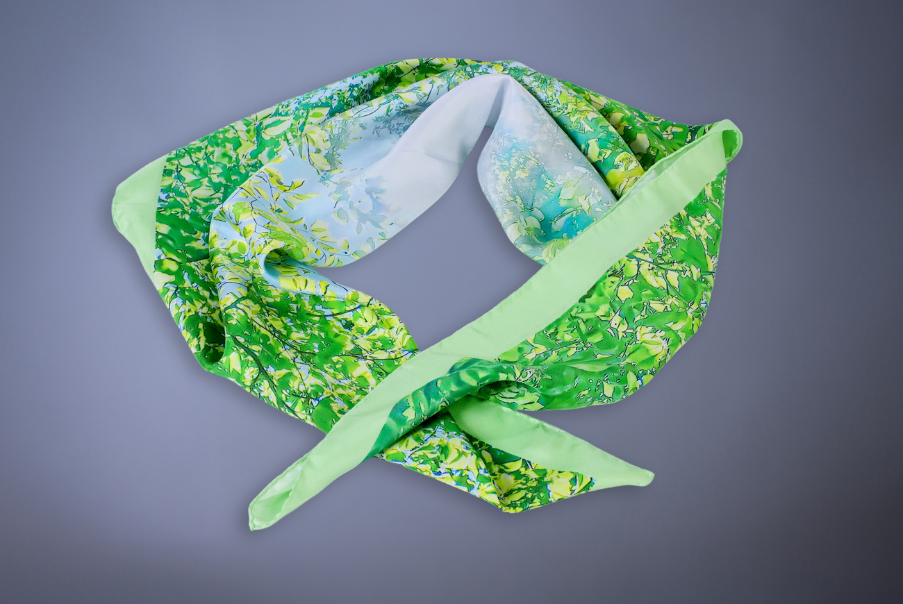 In this exclusive silk scarf, soft green, vibrant green, white, and clear light blue combine to evoke the power of nature. All elements come together in a fresh, lively play of colors — creating a naturally beautiful feeling.